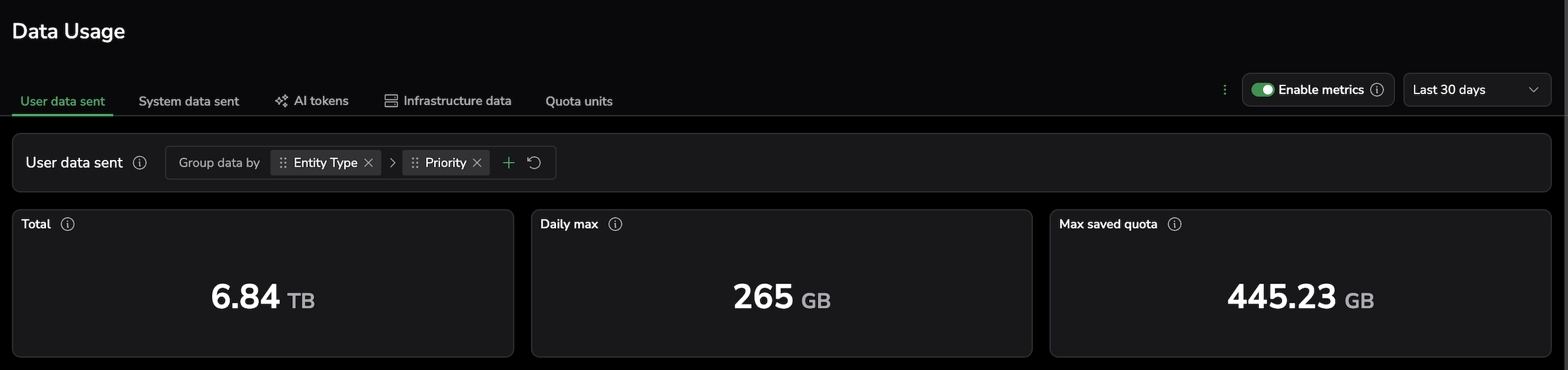 Enable Data Usage Metrics to view real-time usage patterns. Build dashboards, set alerts, and generate summaries.