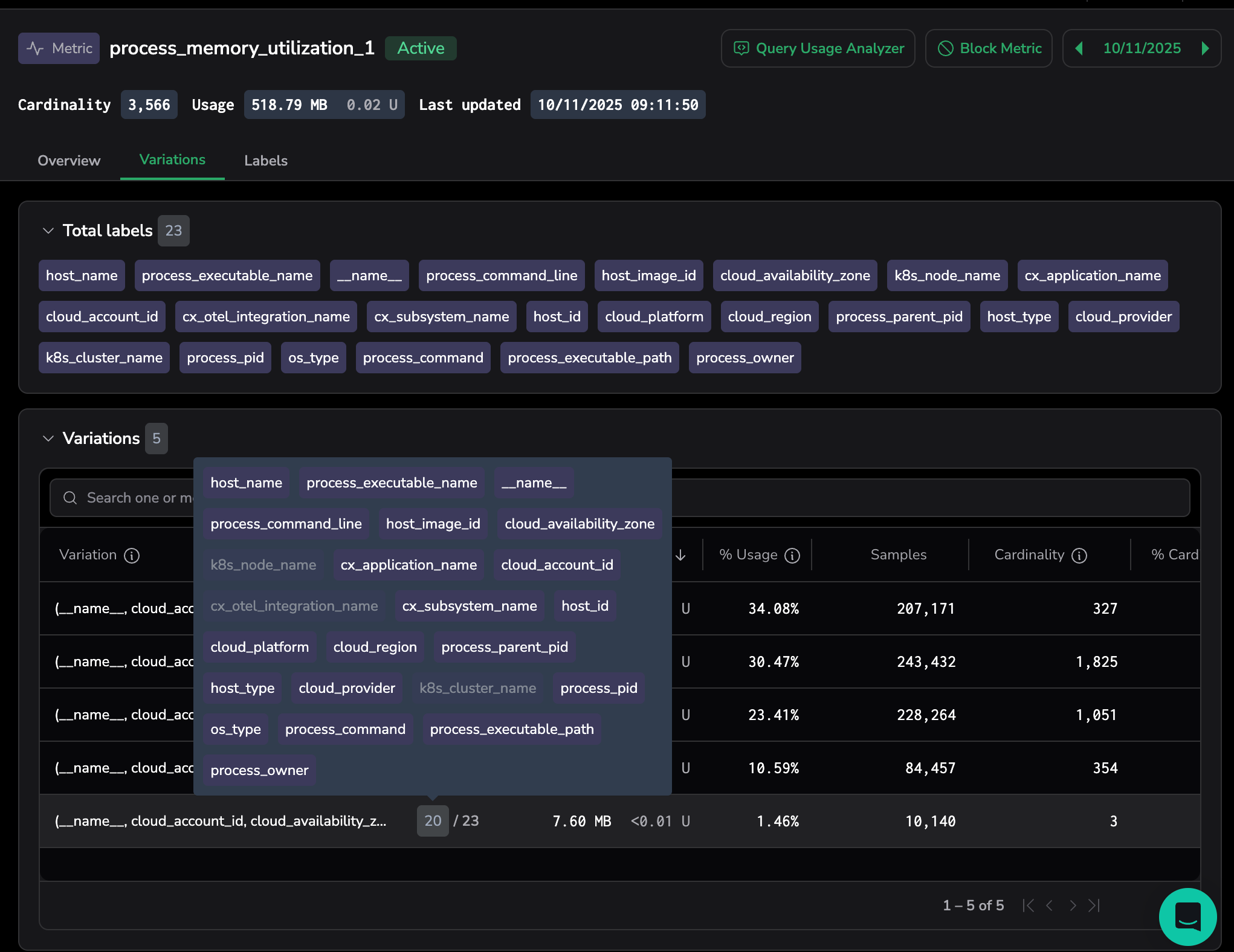 This helps you see how label sets differ across variations and quickly identify which labels contribute to extra cardinality.