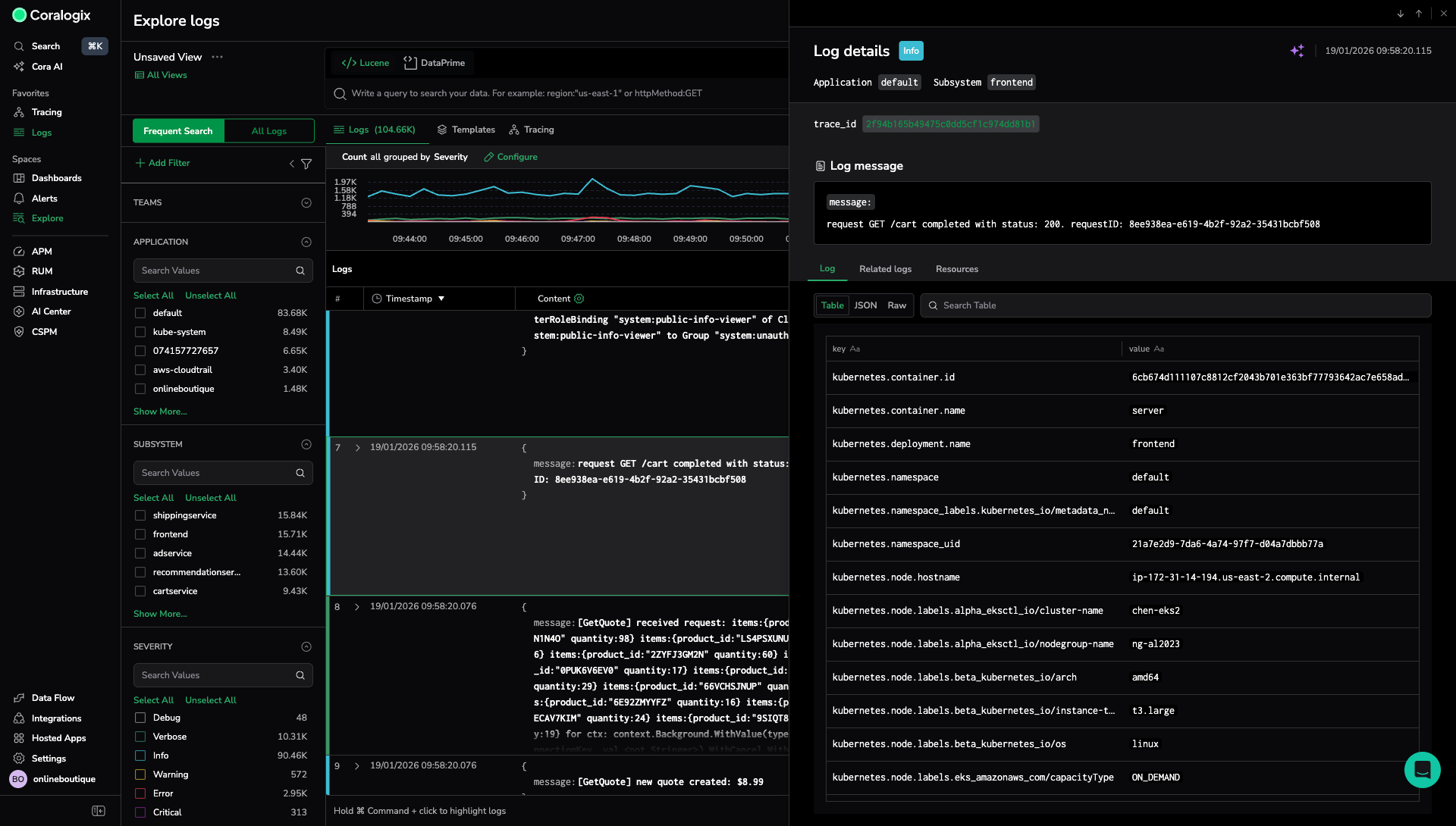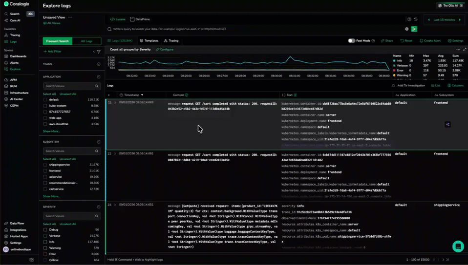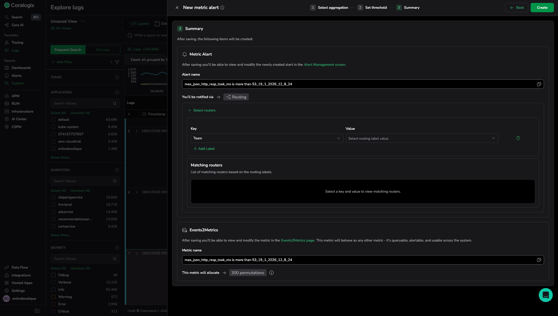This feature lets you turn a single log entry into a working alert. Coralogix creates the Events2Metrics configuration and the alert for you, and shows historical values during setup so you can verify that the signal is meaningful before you create the alert.