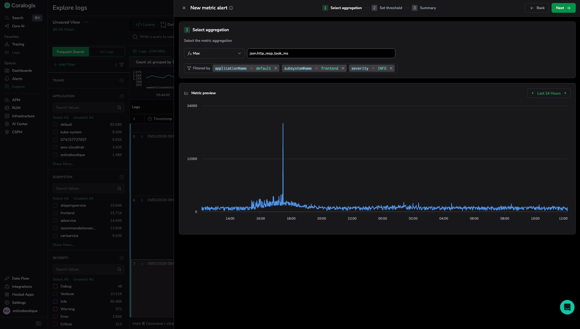 In the Set threshold step, tell Coralogix what “too slow” looks like.