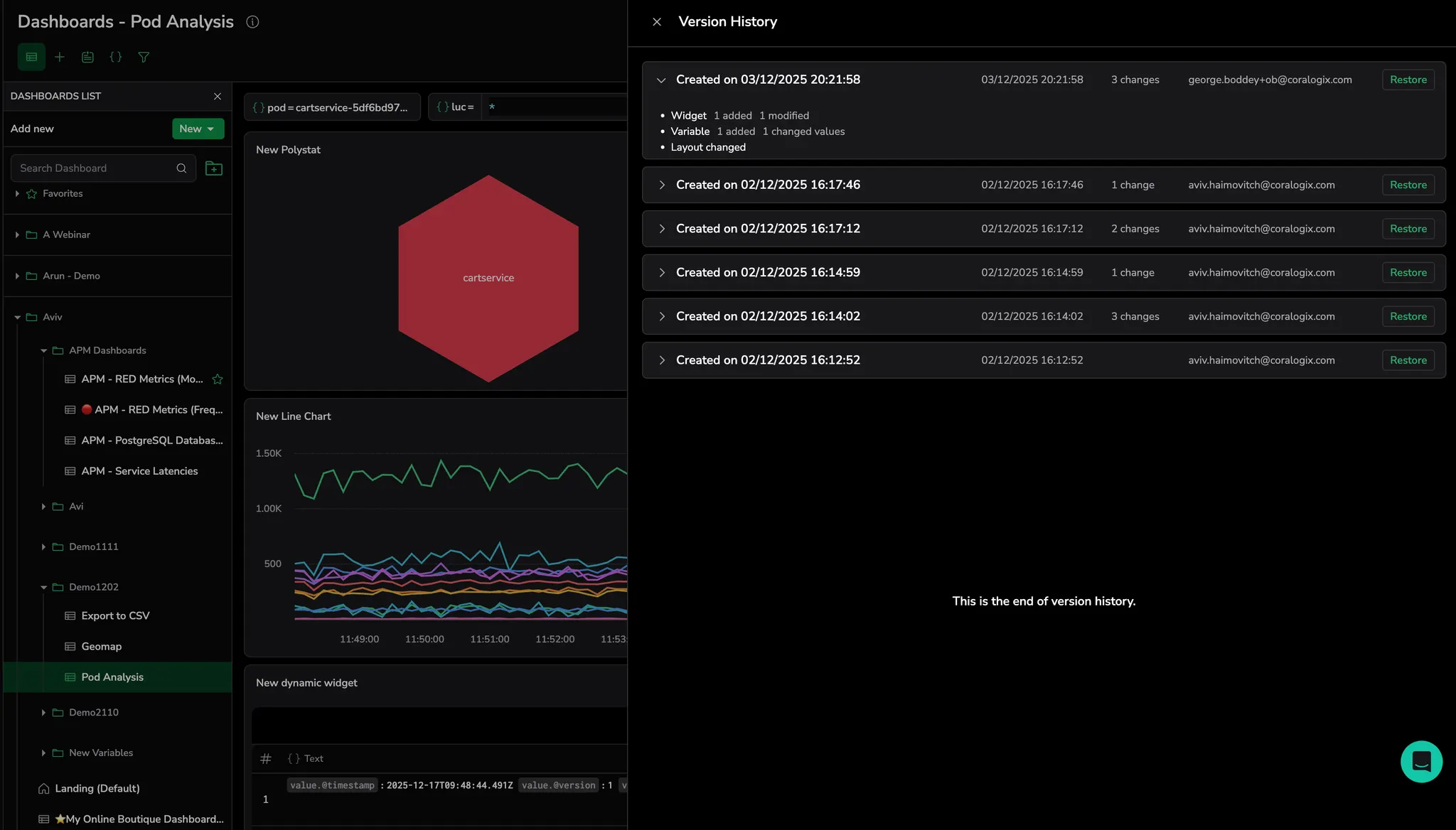 Dashboard version history lets you safely review, compare, and restore previously saved dashboard states. Each time you save a dashboard, the system saves a copy of that version. This ensures earlier versions of your dashboard are not lost. Dashboard version history lets you view and restore previously saved dashboard versions.