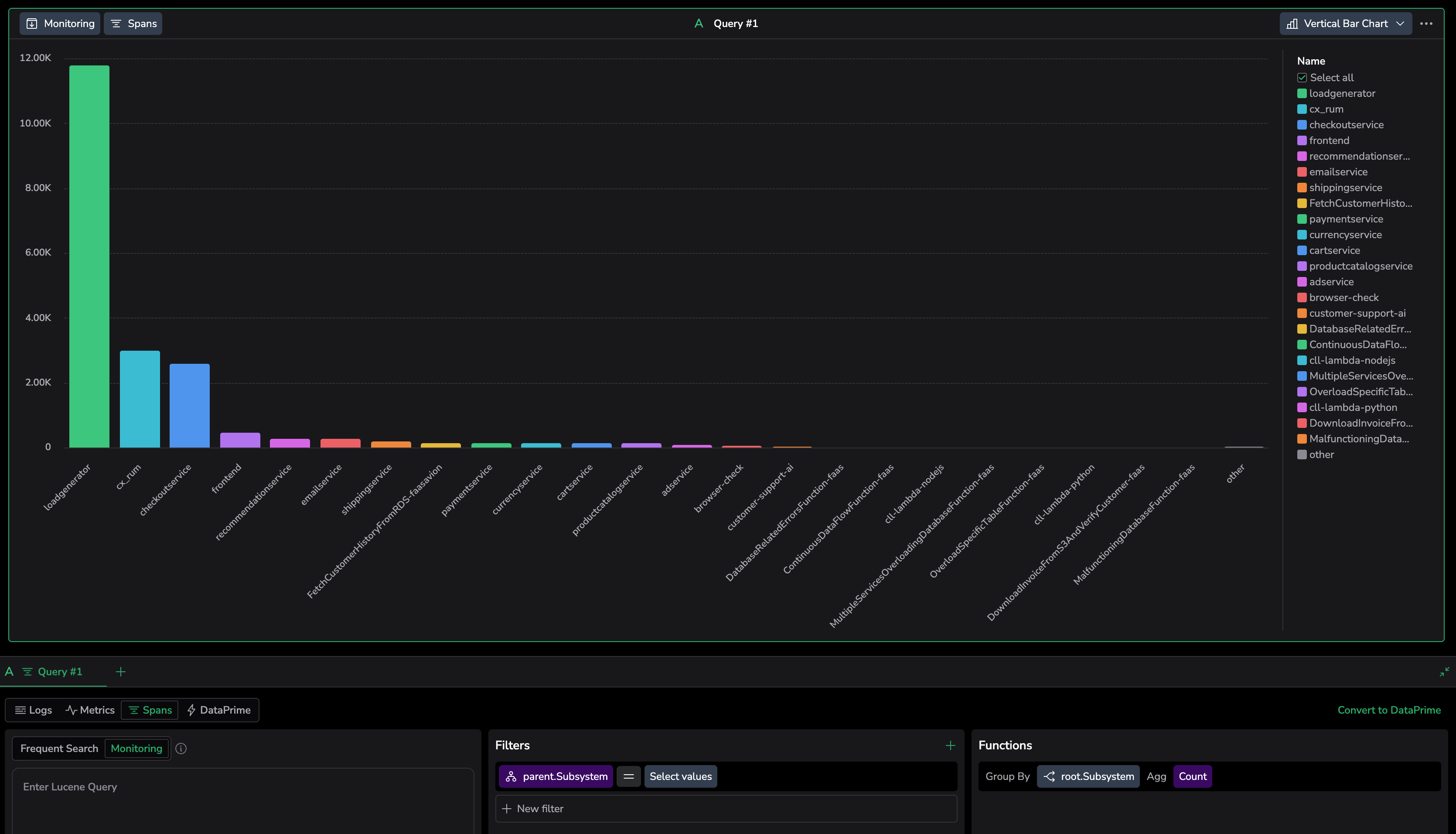 Use Coralogix's Query Builder in both Visual Explorer and Custom Dashboards to query spans based on their relationships within a trace. Create more targeted and insightful queries by applying relational prefixes (root., parent., any.) to existing fields.