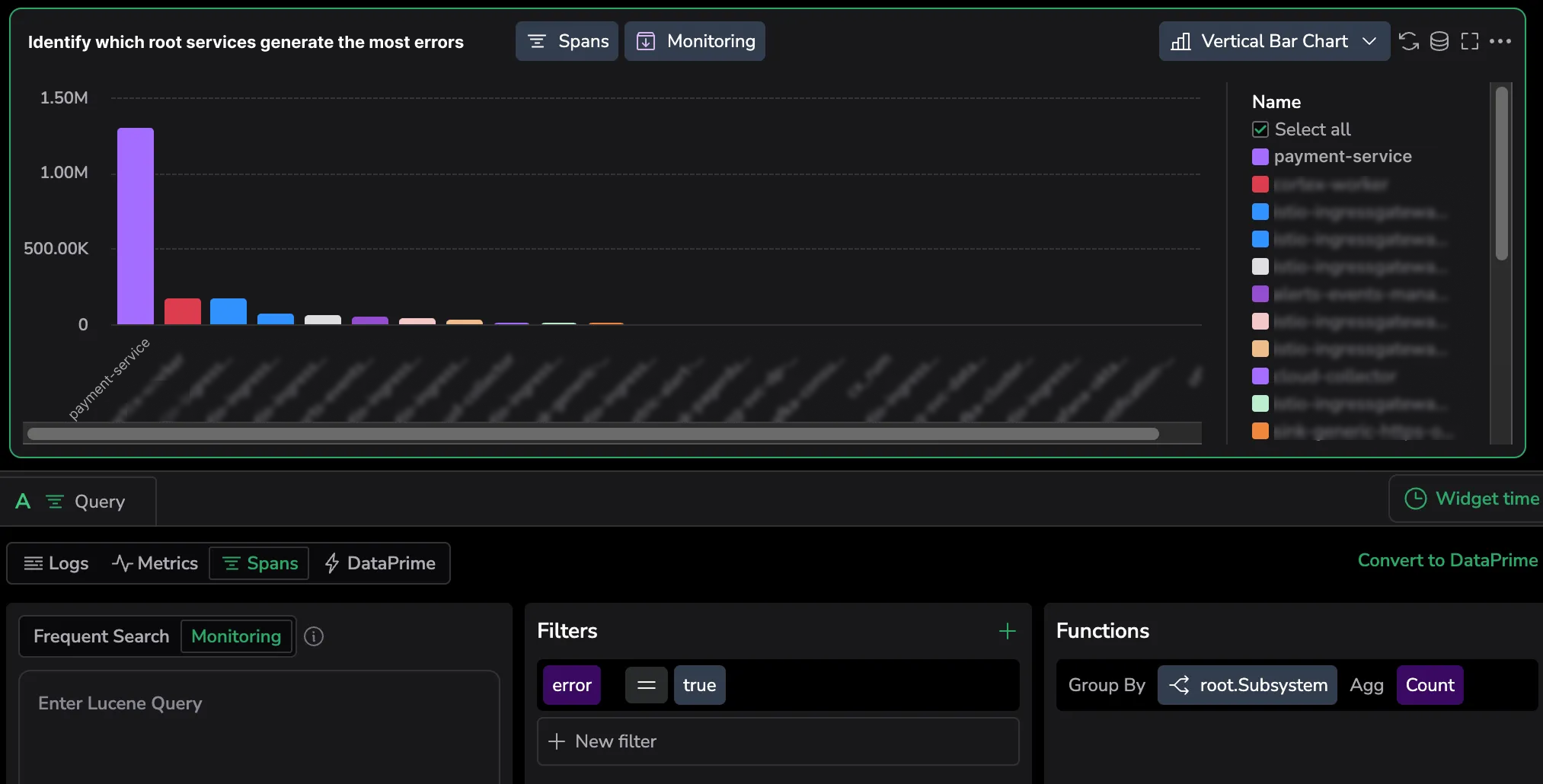 Most errors originate from traces whose root is payment-service, even though the errors appear later in downstream services. This helps you focus your investigation on the initial request flow rather than isolated spans. The image below shows this use case in the Coralogix UI.