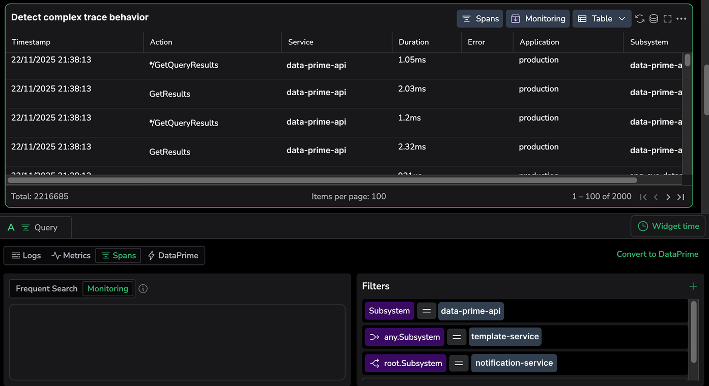 Only traces that start with notification-service and include template-service show elevated latency or atypical behavior in data-prime-api spans. This relational query isolates a cross-service dependency issue that is impossible to detect using nonrelational filters alone. The image below shows this use case in the Coralogix UI.