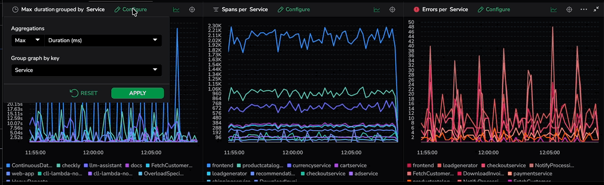 For example, select Max Duration grouped by Service, then select the highest data point to open the drilldown on the slowest span in that service—useful for pinpointing which backend is causing latency spikes.
