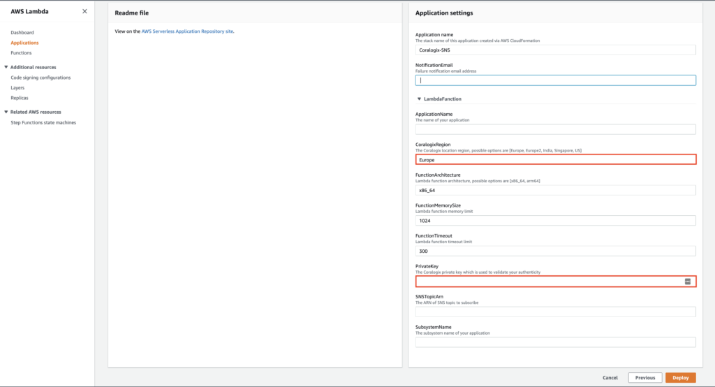 - Do not change the default settings for the FunctionMemorySize and FunctionTimeout.