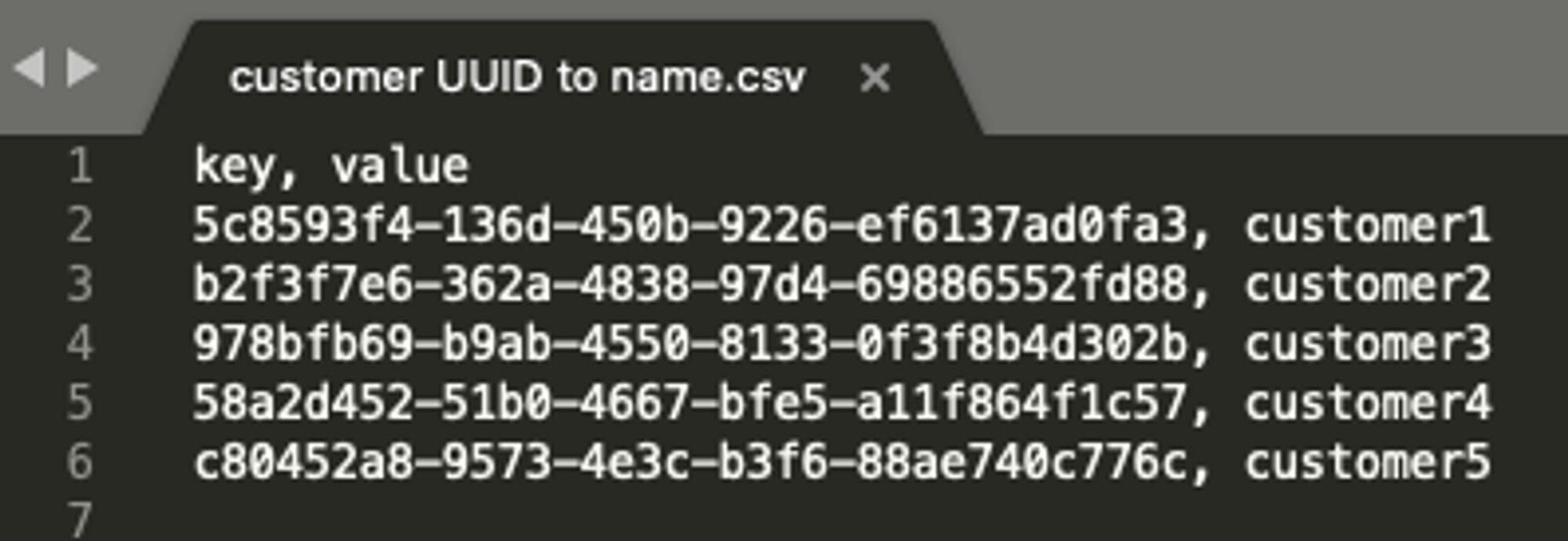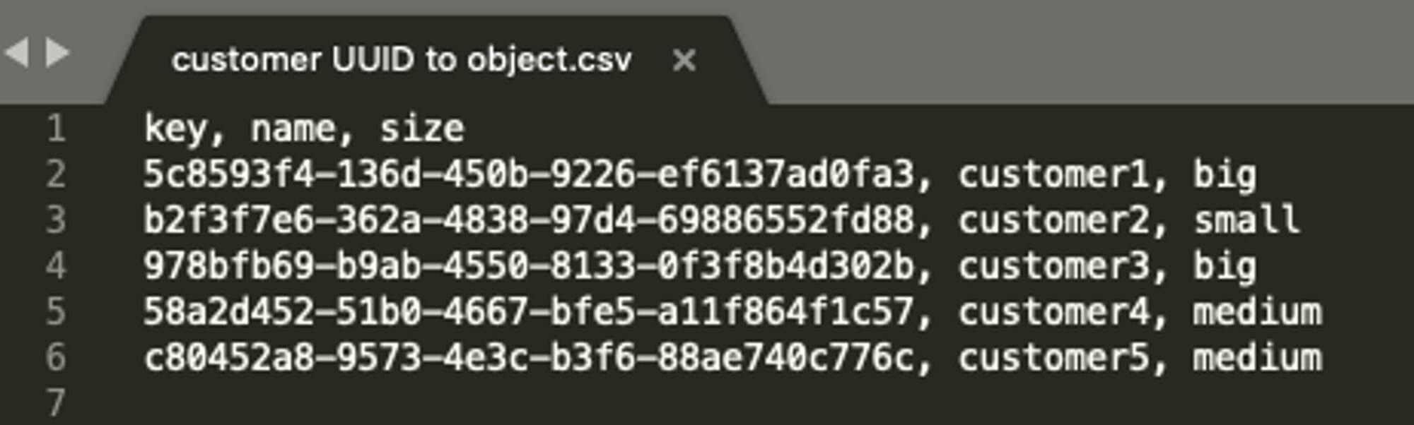 To define your custom data source, create a CSV file with either string-to-string or string-to-JSON mappings. CSV files must contain a minimum of two columns, all of which must have titles. Users may select any column from the file that maps to the log field and the columns from which to enrich the logs.