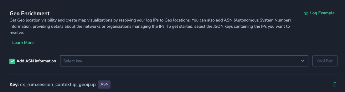 - To add ASN information to an existing geo enrichment, select the enrichment row to open the editor, then enable Add ASN information.