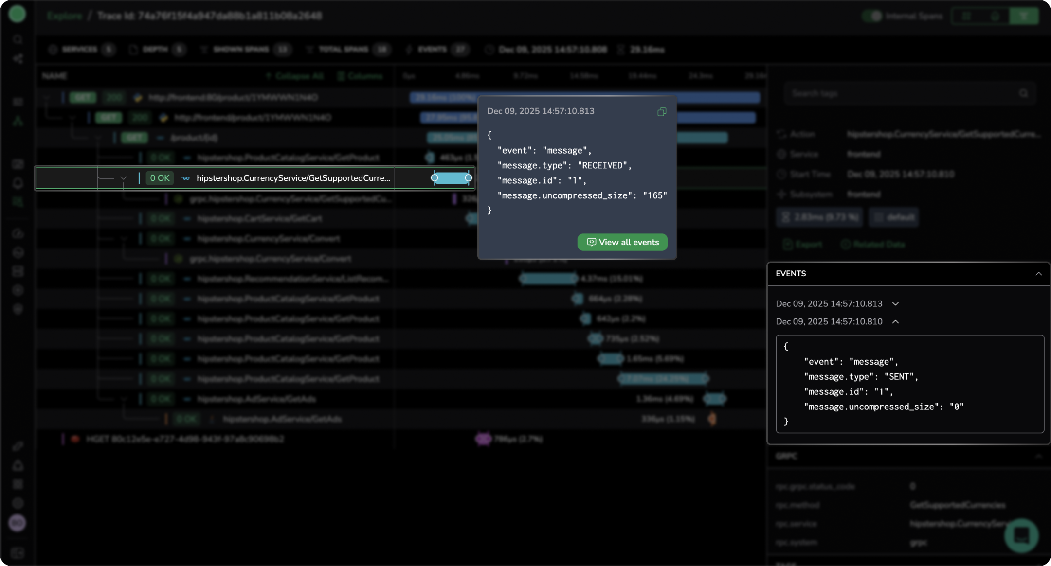 When drilling into a specific trace or span, Gantt view displays events directly on the timeline. Quickly understand what happened at each point in the execution flow without leaving the trace.