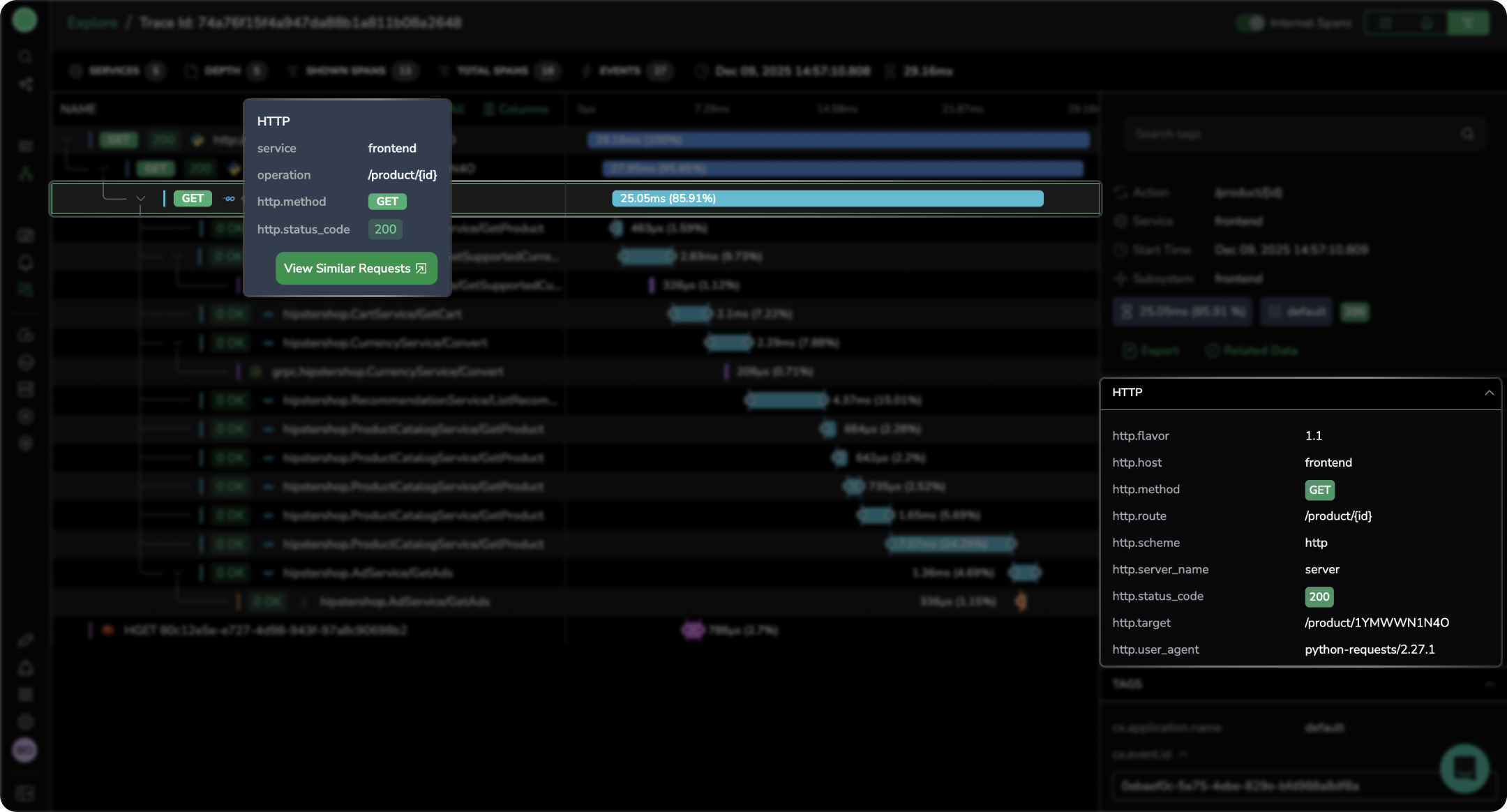 This lets you investigate patterns or anomalies across similar gRPC or HTTP requests with one click.
