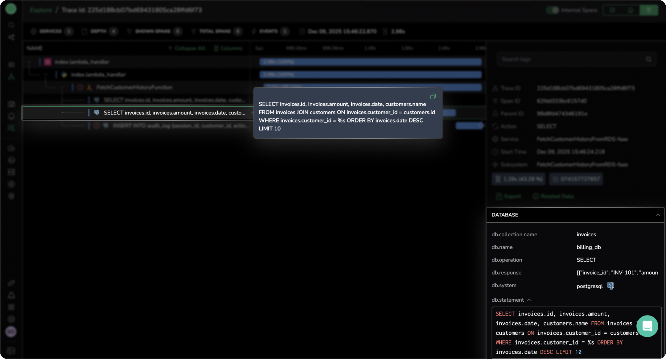 For database spans, select View similar queries to see the exact query executed and the table involved.