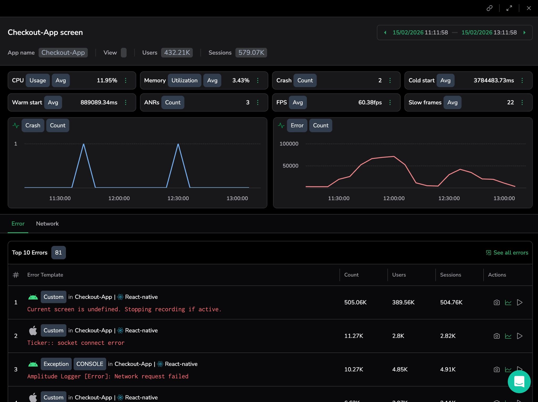 - Network performance, where slow or failing requests can contribute to long load times or stalled screens.