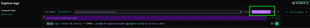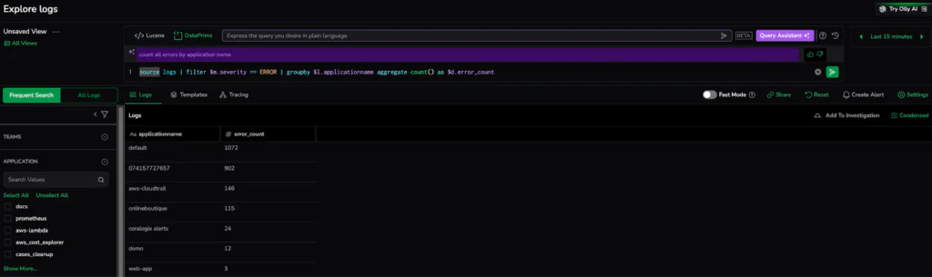 From Conversation to Code: From the logs explore screen, enabling the Query Assistant turns your search bar into an intelligent collaborator. In the example below, we entered a simple request to “count all errors by application name”. The system instantly generated the exact DataPrime pipeline required to filter by severity and aggregate the results: source logs | filter $m.severity == ERROR | groupby $l.applicationname aggregate count() as $d.error_count. This seamless translation delivers a precise diagnostic report in seconds, proving that you don’t need to be a query expert to get expert-level insights.