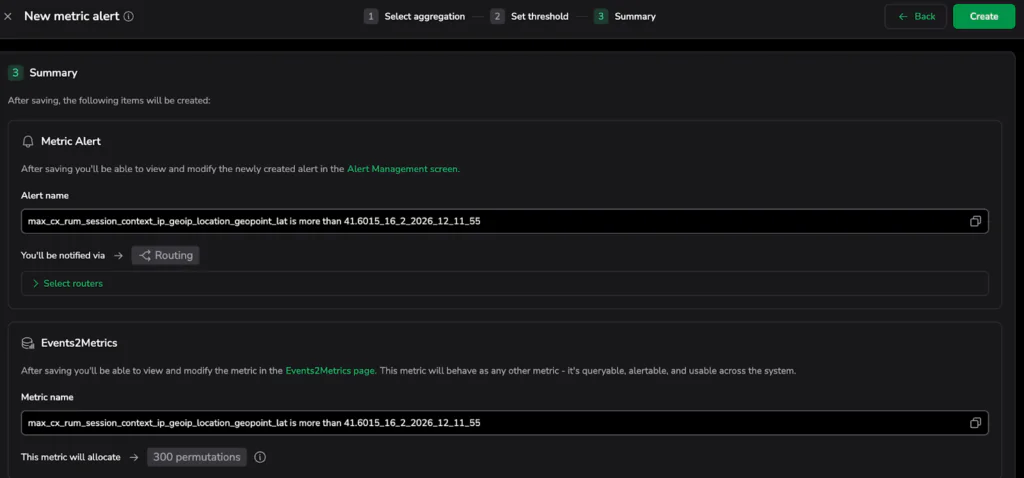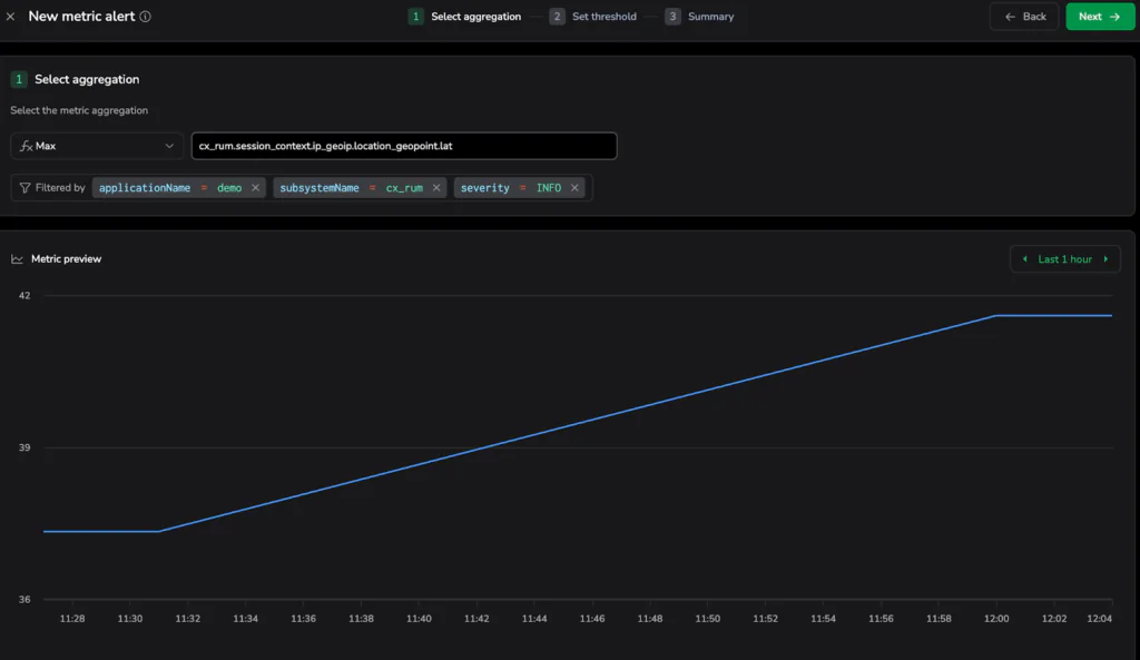 - Aggregation and Filtering: The system automatically scopes the alert to the demo application and cx_rum subsystem, calculating the Max value for the user’s geographic latitude.