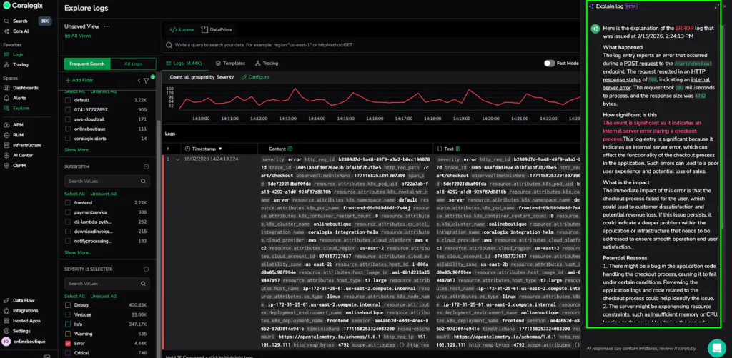 In the example below, we have a raw JSON log for the frontend service showing an HTTP 500 error on the /cart/checkout path. Instead of manually parsing fields like trace_id or k8s_pod_uid, Explain Log instantly tells us that the checkout process failed, potentially leading to customer dissatisfaction and revenue loss. It even suggests looking for application bugs or resource constraints on the t3.large host in the us-east-2 region. What was once a wall of text became an actionable diagnostic report in seconds.