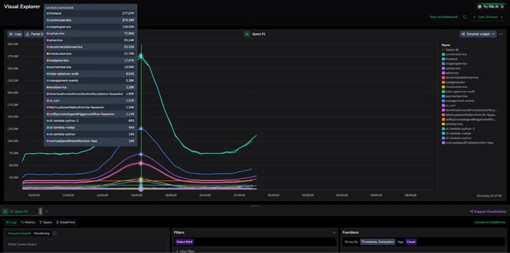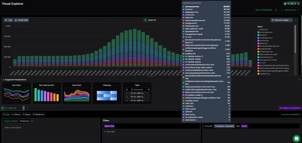 In the attached screenshot, the Visual Explorer tracks multiple services simultaneously, creating a high-density dataset. Once the “Suggest Visualizations” button is clicked, the UI re-evaluates the query results, offering the best chart type for that specific data point. Once you select a specific chart, the UI preserves your choice, ensuring the system assists your exploration without overriding your intent.