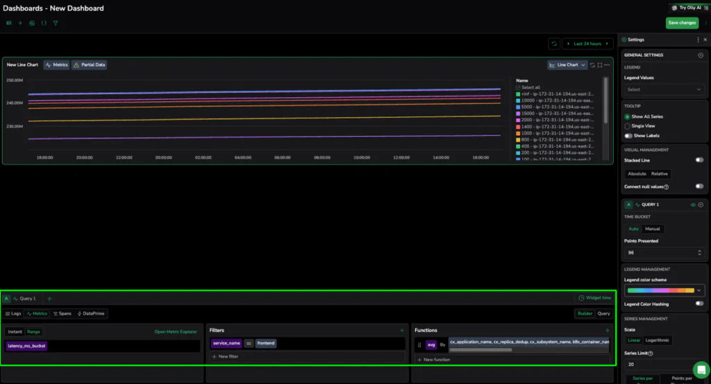 Point-and-Click Metrics in Action In the dashboard setup, the Query Builder allows you to define your data source and instantly begin shaping the output. As seen in the example below, we transformed a single metric into a high-density comparison by simply clicking the “+” icon to add an aggregation. By selecting AVG and grouping the results by infrastructure labels like cx_subsystem_name and k8s_container_name, we created a live leaderboard of system performance—all without writing a single line of query language. This visual approach transforms the technical task of query drafting into a streamlined, frictionless experience that delivers expert-level insights in seconds.
