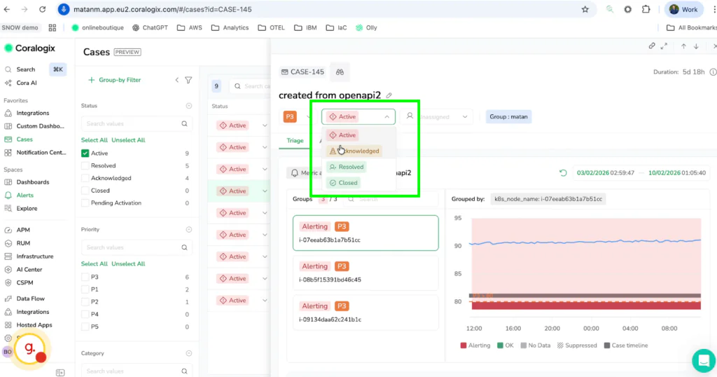 - Resolution: Resolving a Case in Coralogix or an Incident in ServiceNow instantly triggers a status update in the counterpart system.