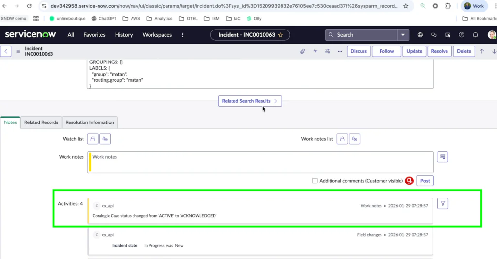 - Acknowledgement: When a user acknowledges a case in Coralogix, the ServiceNow record moves to In Progress.