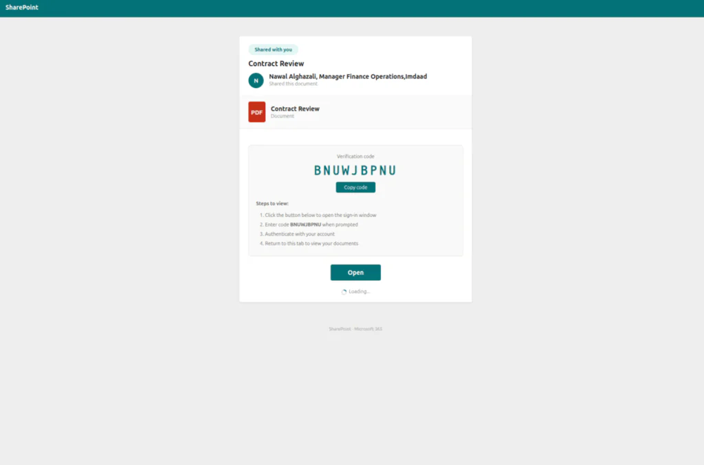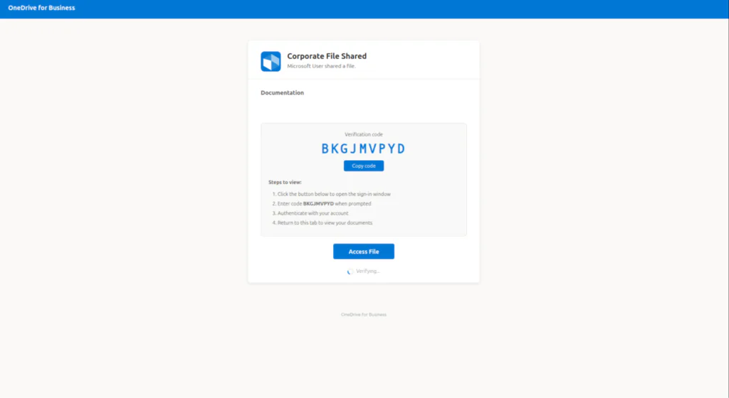 Phase 4 – Device Code Capture: The landing page dynamically generates a live device code via a background script that interacts with the Microsoft identity platform. The code is displayed to the victim alongside a button redirecting to the legitimate Microsoft login portal.