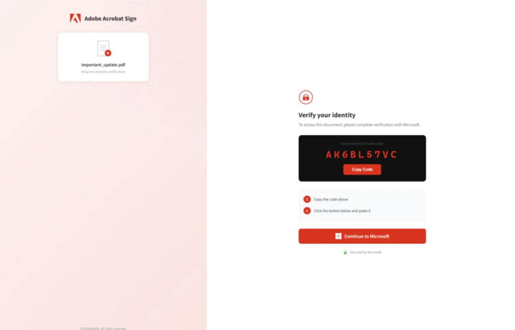 - They land on a phishing page impersonating something like Adobe Acrobat Sign or SharePoint. The page shows a device code and says something like “verify your identity to access this document.”