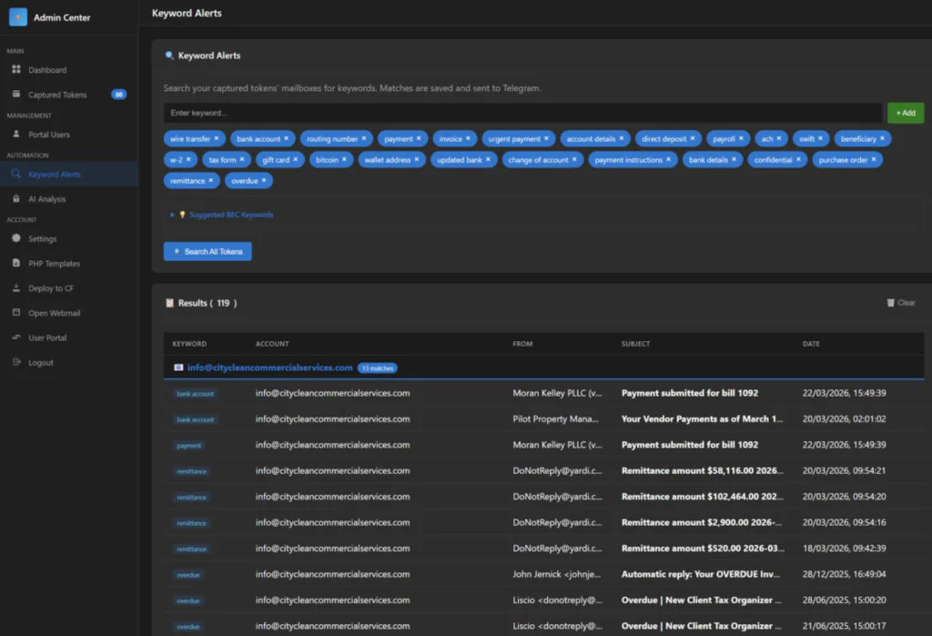 • Automated Post-Compromise Operations: Stolen tokens are immediately used via Microsoft Graph API for email enumeration, data exfiltration, inbox rule creation, and lateral phishing – often within minutes of the initial compromise.