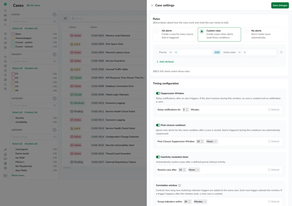 Not all alerts become Cases. Case filtering rules decide which alerts matter and how they should be grouped. But every Case is always built from one or more alerts, giving teams a clear view of one problem instead of many disconnected notifications.