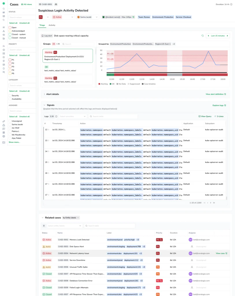 Cases introduces a new way to handle incidents in Coralogix. Instead of showing alerts in isolation, we group related alerts into a single Case and immediately surface the logs, metrics, traces, and service metadata behind them.