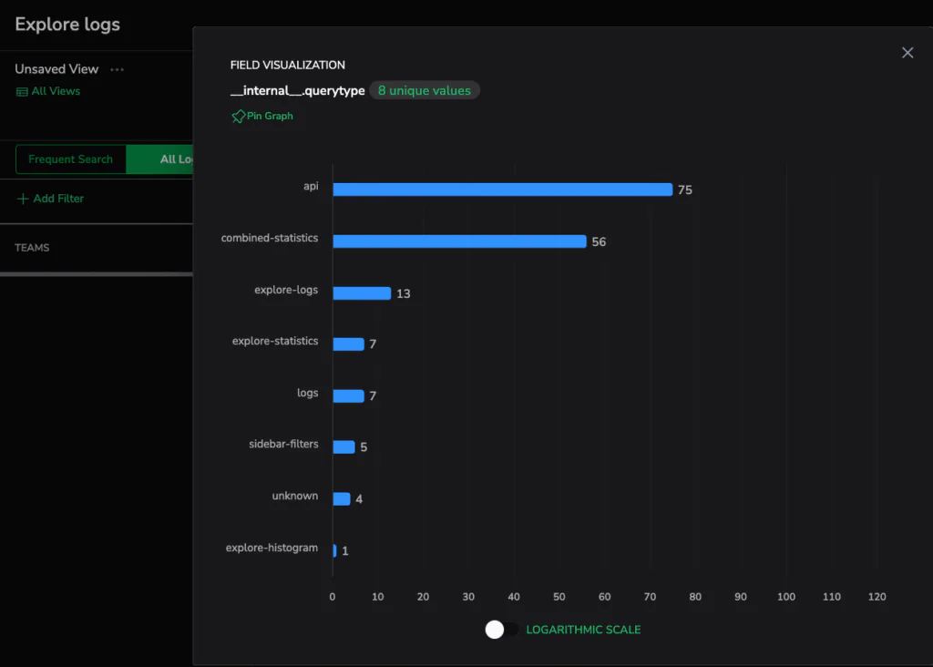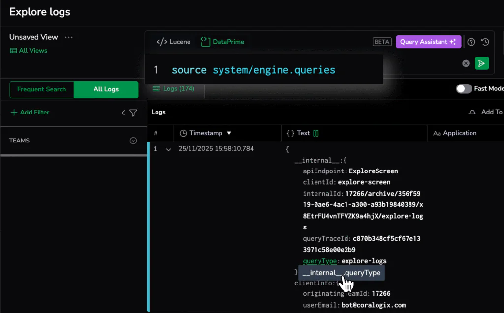 After enabling the engine.queries dataset in the System Dataspace, every query executed in your account becomes observable. Each record tells you where the query originated inside Coralogix, whether it came from Explore Logs, dashboards, the public API, sidebar statistics, filters, or other internal system calls.
