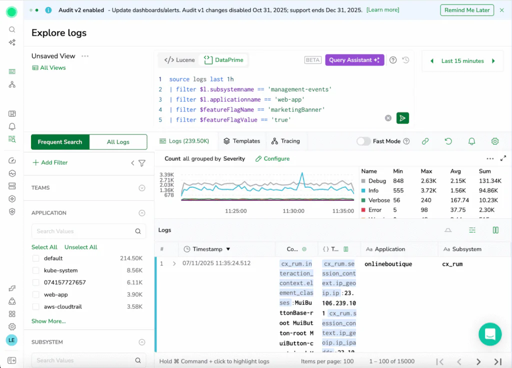 • Use Coralogix DataPrime queries over your logs and RUM events to drill into exactly what’s happening for users within the rollout. You can filter to specific paths, error codes, or user cohorts and see whether the new experience behaves differently from the control.