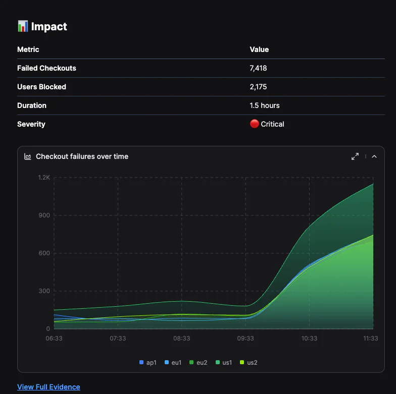 In my investigation, Olly quantified impact, counting distinct affected users and total errors. That immediately tells me whether I’m looking at localized noise or a user-facing event requiring escalation.