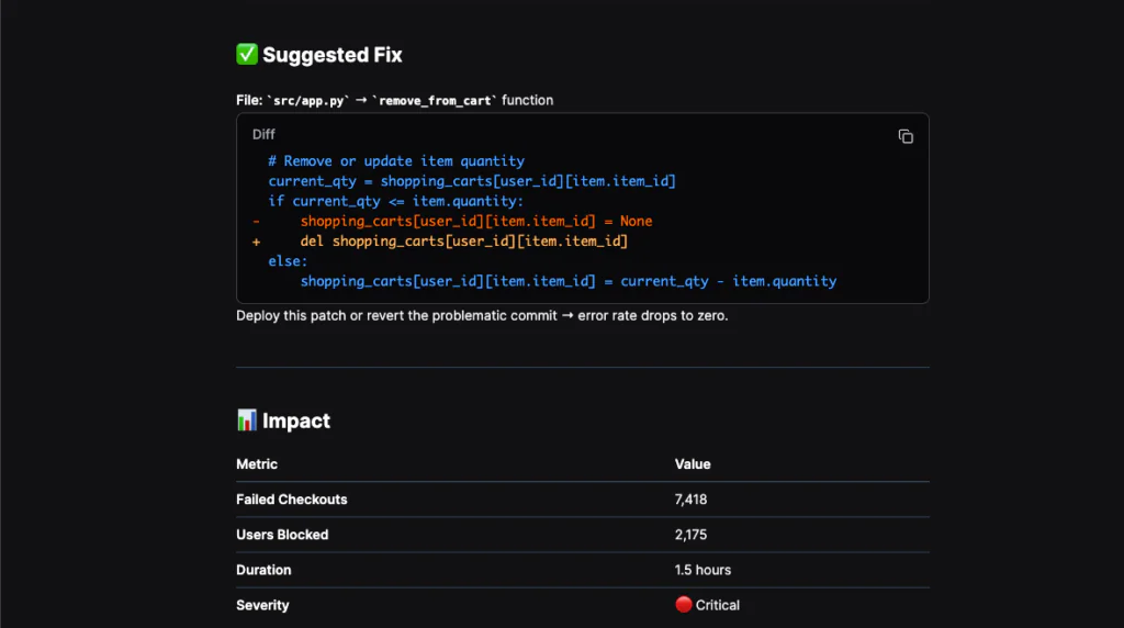 In this example, the investigation moved from metrics to logs to code. The failure was traced to a TypeError in the checkout function attempting to sum a cart value that included None. That aligned exactly with the spike in failed checkouts.