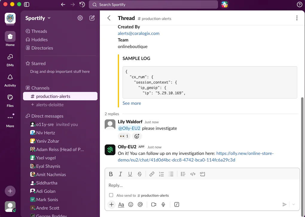 I told Olly to investigate directly in Slack, and from there Olly ran the investigation end-to-end. Let’s check it out.
