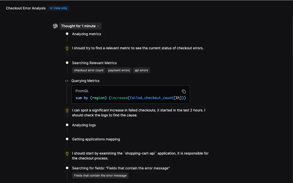 In the case of my alert, Olly started by querying checkout failure metrics and immediately detected a significant spike in the last two hours. That establishes temporal deviation before any deep dive.