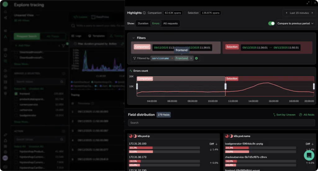 In this example, the k8s.node.name field shows that one server’s share has increased by 58.7% between the two time periods and now appears in over 9.64K spans, with a sharp rise in errors compared to the other servers.