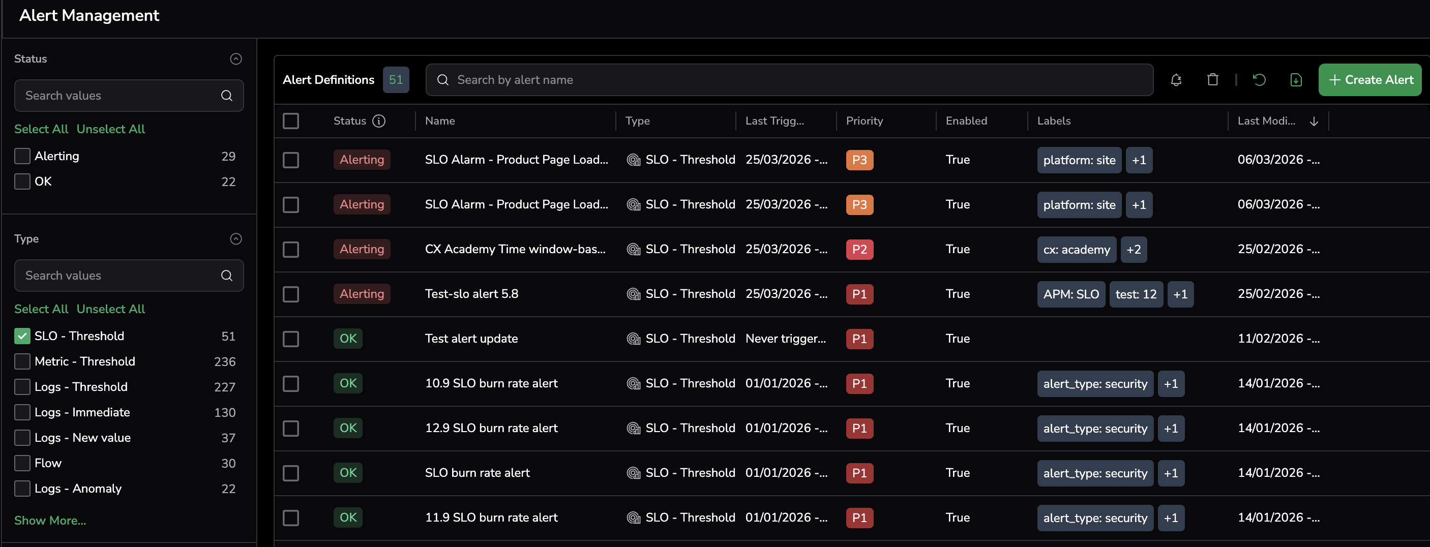 Once created, the SLO alert is displayed in the Alert Management page under Alert Definitions. Group by the SLO - Threshold type to view all SLO alerts.