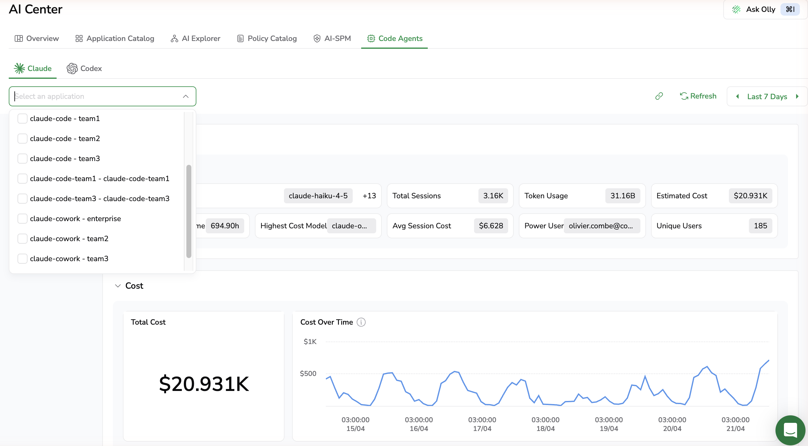 Once your Claude Code sessions are streaming telemetry, navigate to AI Center > Code Agents > Claude to see the unified Claude dashboard. The Select an application dropdown lists every <application> - <subsystem> pair you configured (for example, claude-code - team1, claude-code - team2), so you can slice usage, cost, sessions, and token data by team. If you also instrument Claude Cowork, Cowork data appears in the same dashboard.