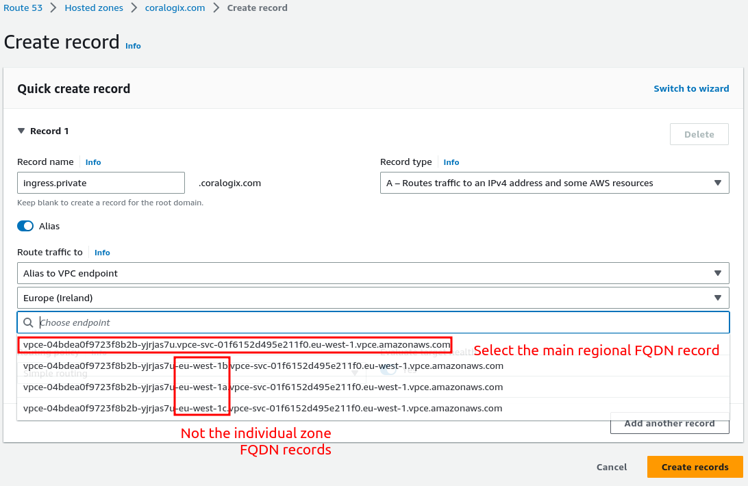 ingress.private. - Configure the record as an alias to a VPC endpoint.