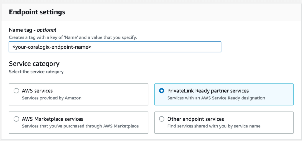 Select Enable DNS name to enable private DNS names for the endpoint. This allows Coralogix private FQDNs (for example, ingress.private.<your-domain>) to resolve to the private IP addresses of the endpoint network interfaces (ENIs) inside your VPC.