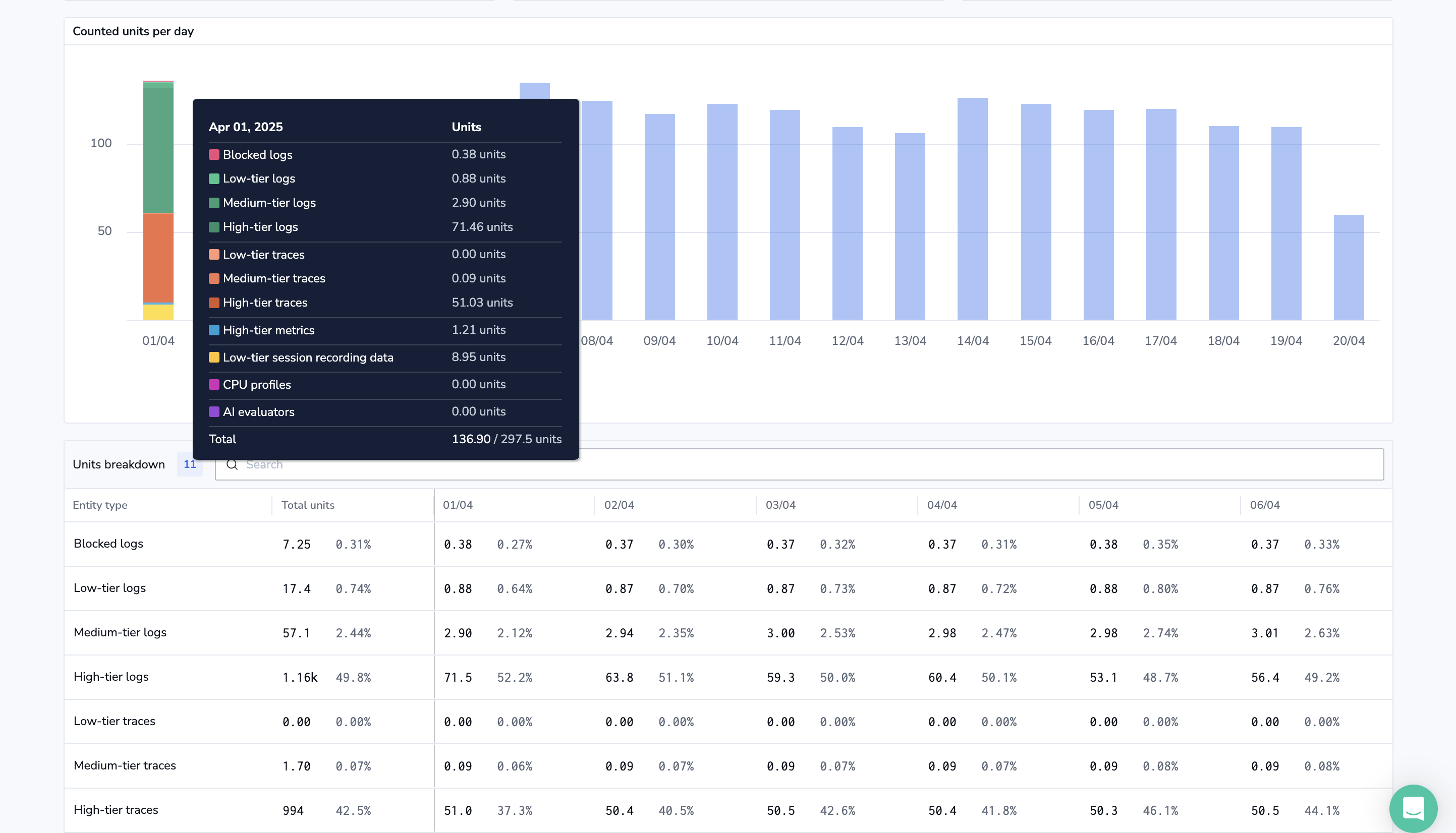 Hover over columns in the bar chart to view unit distribution by day, or scroll to the breakdown grid for detailed totals by entity type.