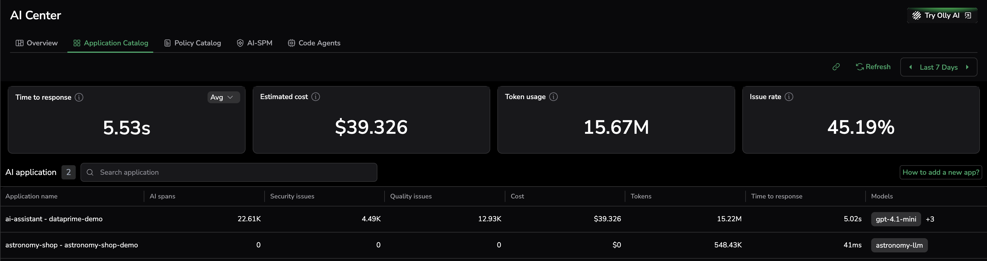 The Application Catalog lists all your AI applications in one sortable table, with response time, cost, tokens, and issue counts visible at a glance for easy comparison.