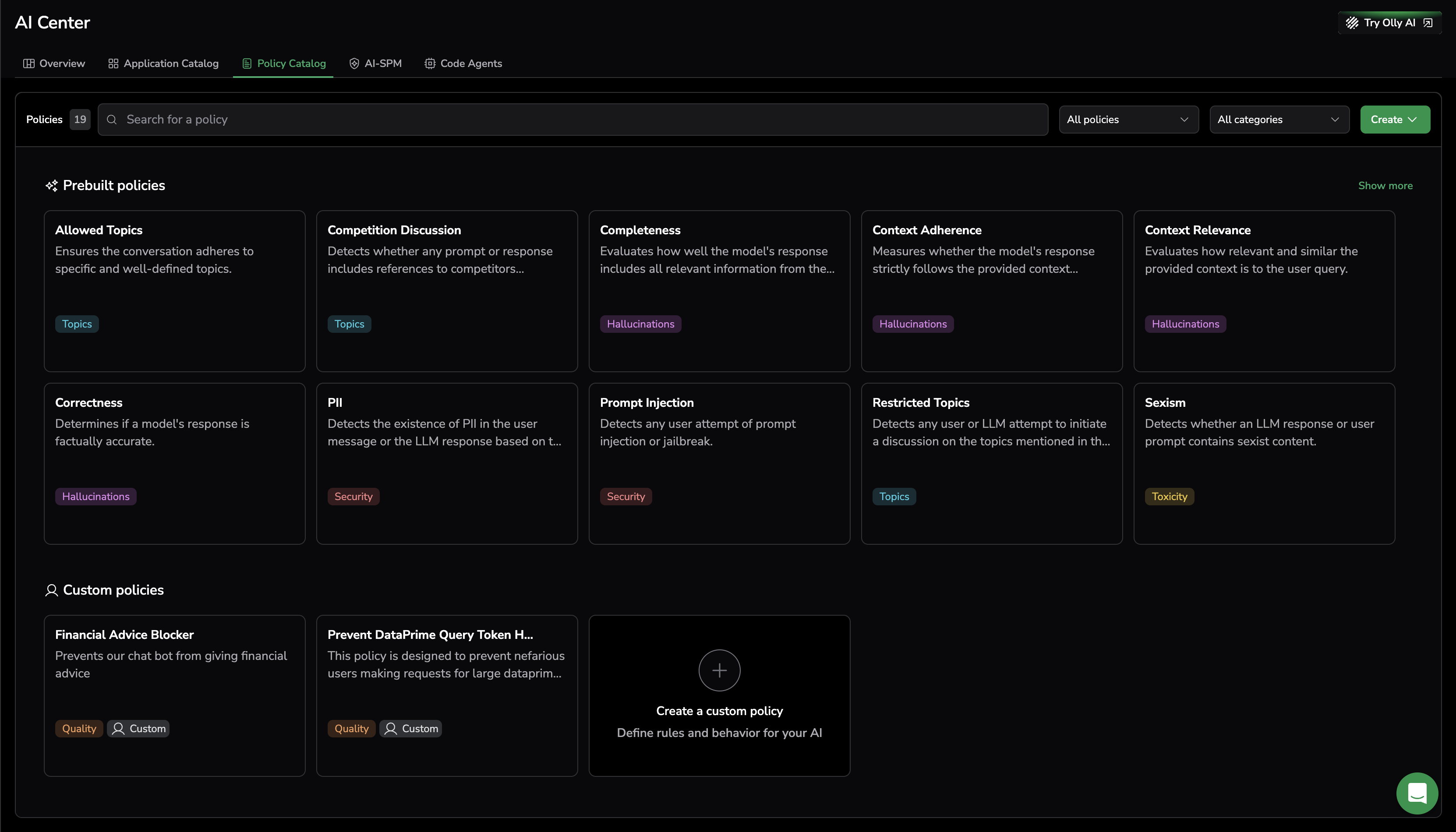 The Policy Catalog brings together prebuilt and custom evaluation policies, letting you configure which behaviors to monitor and enforce across your AI applications.