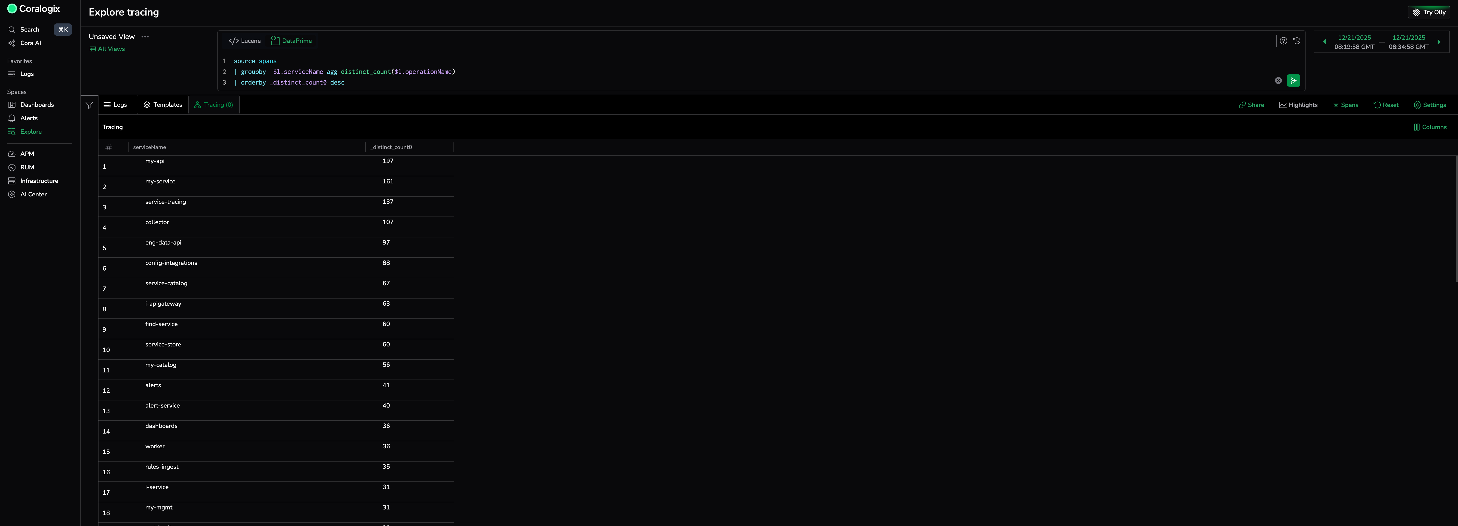 Find services with many unique span names by running the following query in Explore tracing to identify services that produce a large number of distinct operation names: