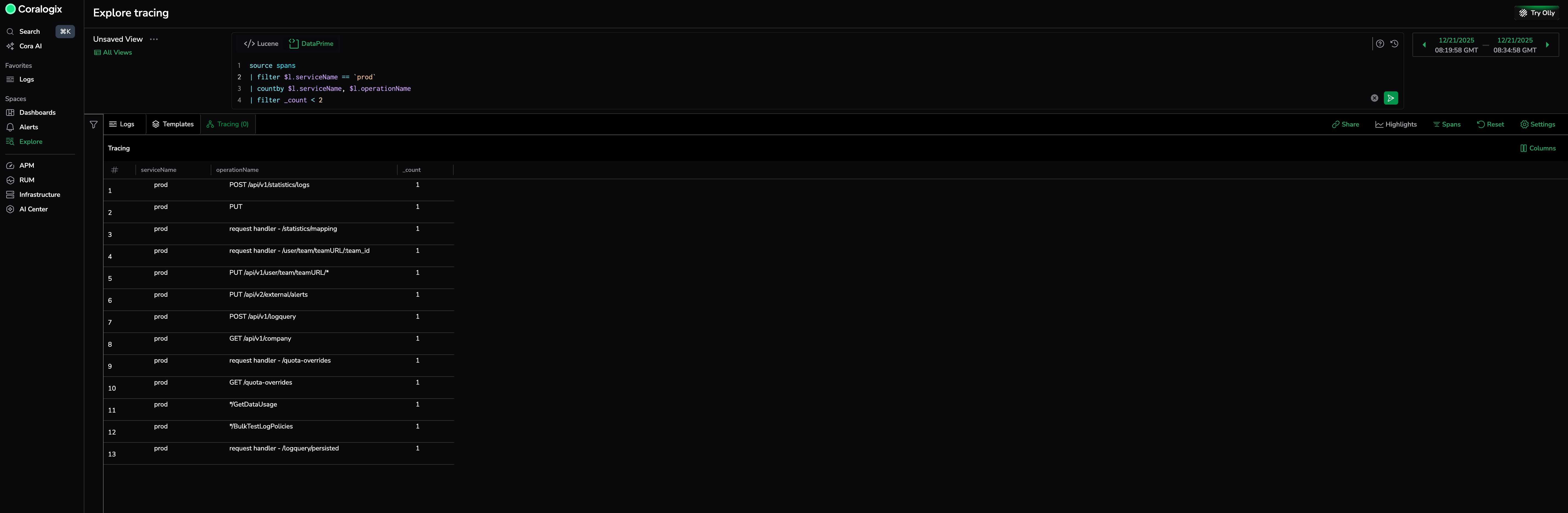 source spans | filter $l.serviceName == `prod` | countby $l.serviceName, $l.operationName | filter _count < 2Look for non-templatized span names generated by frameworks (for example, GraphQL or auto-generated HTTP routes) or span names that embed IDs, UUIDs, or other request-specific values.