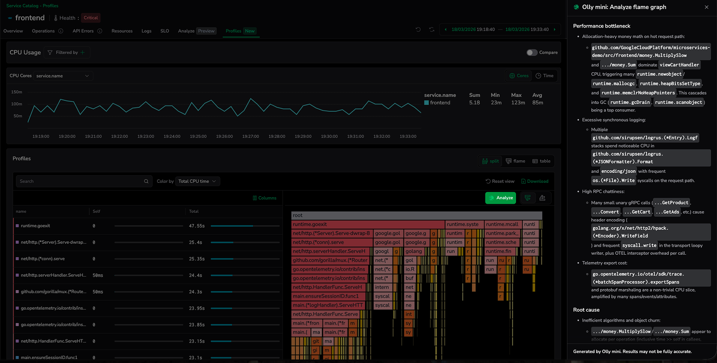 Continuous Profiling enables deep, function-level analysis of CPU usage across your services, allowing you to detect inefficiencies, uncover bottlenecks, and optimize runtime behavior. This page explains how to use the Profiles UI to visualize CPU consumption, explore aggregated stack traces, and correlate performance trends with infrastructure or code-level changes. You can also compare profiles within a selected timeframe. To learn about compare mode in Continuous Profiling, see Compare Profiles.
