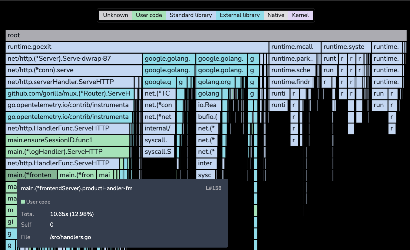 If CPU time is increasing steadily, your service might have inefficiencies that need optimization. On the other hand, sudden spikes or dips can signal an issue such as inefficient garbage collection, unexpected traffic loads, or code regressions. Once you’ve detected when and how CPU consumption changes, use the stack trace visualization to dig deeper and find which functions are driving high CPU usage.