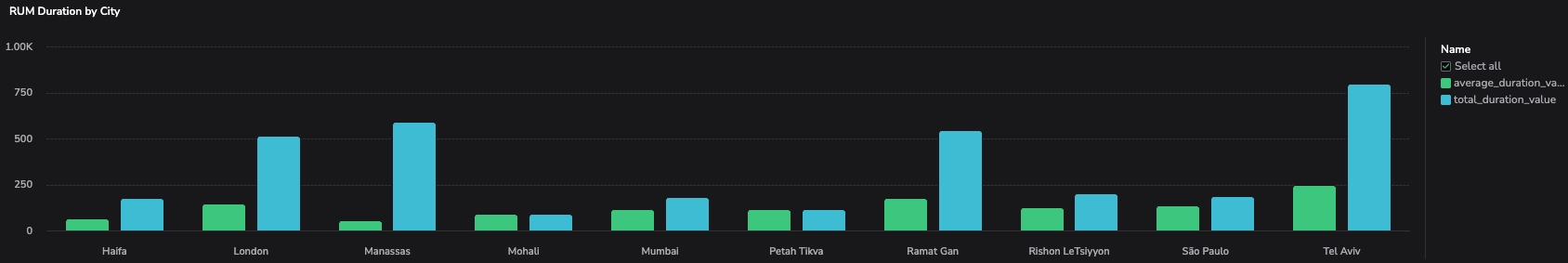 This query calculates the average RUM duration for each city, showing the typical user experience in that location.