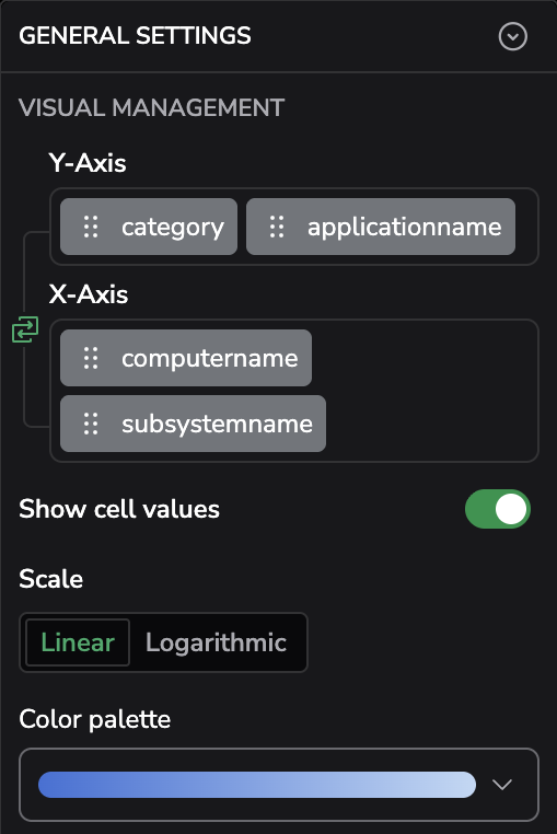 In the Settings panel, expand GENERAL SETTINGS to adjust the heatmap axis data, color display and density in VISUAL MANAGEMENT.