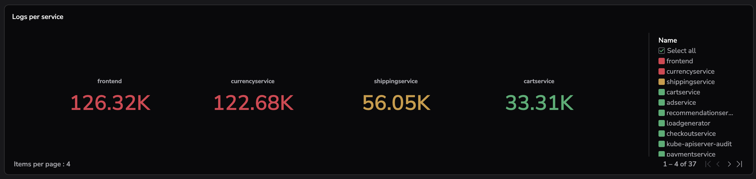 When your query returns multiple rows—for example, 1 result per pod or 1 result per service—the Stat widget displays each result as a separate stat element arranged in a row, with pagination to navigate across all results.