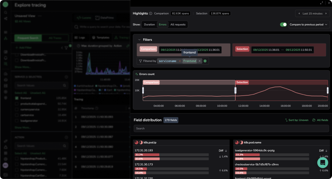 endpoint=/checkoutdominates errors, for example. - Filter In that endpoint and view the results in Compare mode.
